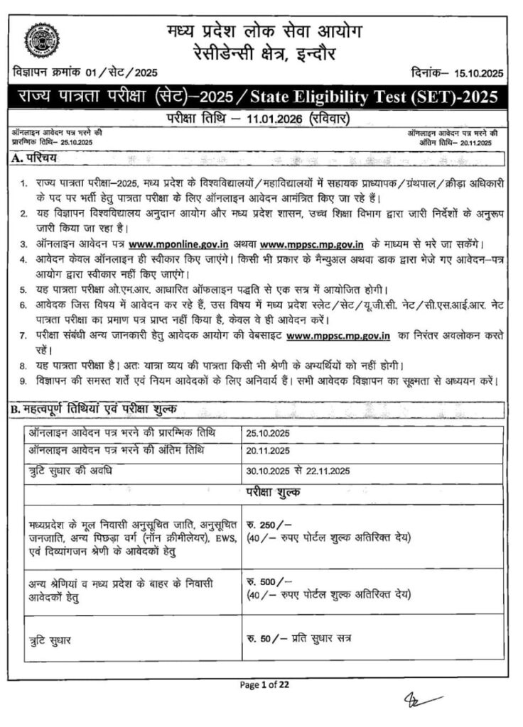 भोपाल (मध्य प्रदेश):- मध्य प्रदेश लोक सेवा आयोग ने एमपी सेट 2025 की आधिकारिक अधिसूचना जारी कर दी है। यह परीक्षा राज्य स्तर पर सहायक प्रोफेसर पद के लिए पात्रता प्रमाणपत्र प्रदान करने हेतु आयोजित की जाती है। इस परीक्षा में सफल उम्मीदवारों को उच्च शिक्षा संस्थानों में अध्यापन के लिए योग्य माना जाएगा।